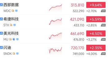 闪迪(SNDK)以720.17美元报收,过去一年累计涨幅突破1194%,令人咋舌;西部数据(WDC)持续刷新历史新高,报收313.81美元,单日涨幅9.64%;希捷(STX)同步走强,涨幅5.59%。