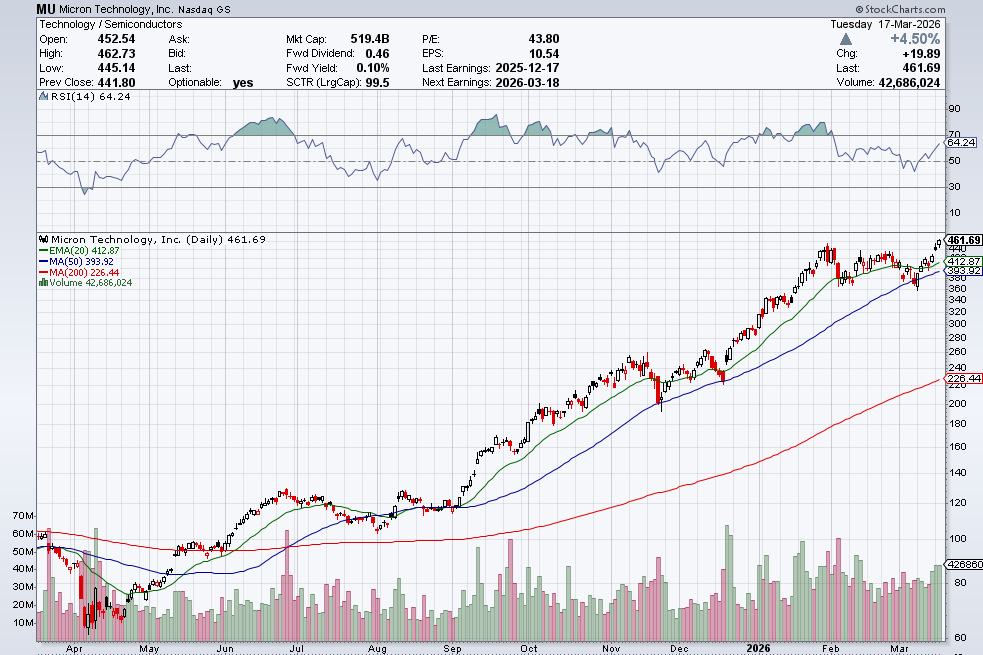美光(MU)市值首次突破5000亿美元大关,单日劲涨4.50%;