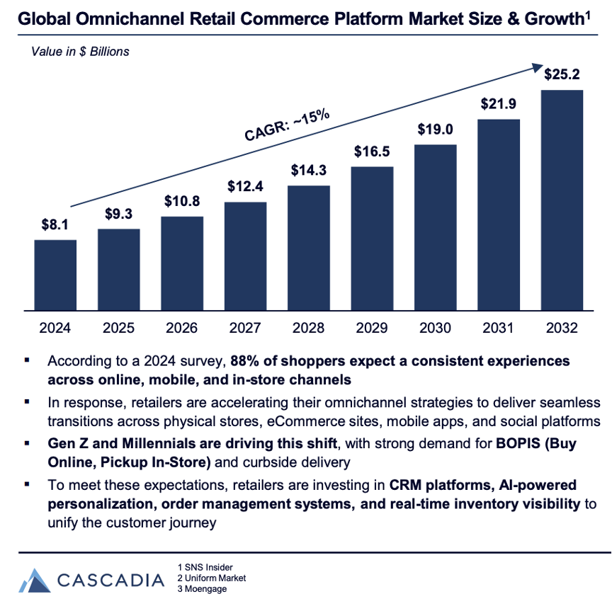 据CASCADIA报告显示,全球全渠道零售商务平台市场预计在2030年突破200亿美元规模,年复合增长率接近15%。在经历了互联网、移动互联网、物联网几轮沉淀以后,新一轮的AI浪潮下,零售巨头们都在努力让AI从过去单一的报表与看板模式,迈向经营决策与执行。