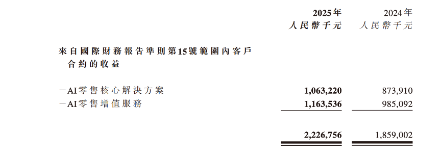 AI零售核心解决方案收入约10.63亿元,同比增加21.7%;AI零售增值服务收入约11.64亿元,同比增加18.1%。两条腿都在走路,而且增速并不依赖单一业务。