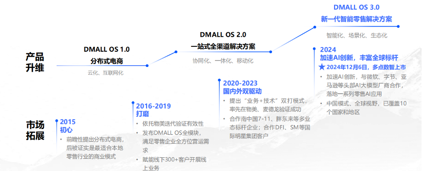 早期公司做的事情很纯粹,2015年切入零售市场,主要是把线下零售的交易、会员、库存、履约这些核心链路数字化,通过Dmall OS把一套完整系统搭起来,再向外复制。