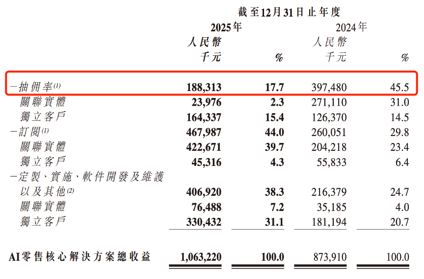 因为公司过去参与只是零售交易过程,收入以GMV抽佣为主,AI零售核心解决方案统一口径下2024年抽佣收入高达45.5%。