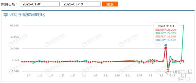 3月18日,涤纶POY突发暴涨67.56%,价格飙升至15625元/吨,三月内每吨最高涨超9000元。