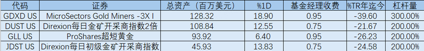 做空方向的ETF则出现明显上涨。两倍做空金矿指数的 $二倍做空黄金矿业指数ETF-Direxion(DUST)$ 上涨12.55%,两倍做空黄金的 $2倍做空黄金ETF-ProShares(GLL)$ 上涨6.40%,而两倍做空初级金矿股的 $金矿指数二倍做空ETF(JDST)$ 上涨13.83%,反映出金价下跌背景下反向产品的放大效应。