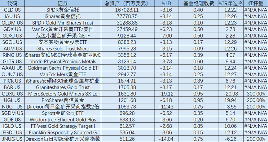 从单日表现来看,黄金相关ETF整体普遍下跌。昨日实物黄金ETF方面, $黄金ETF-SPDR(GLD)$ 下跌3.16%, $黄金信托ETF-iShares(IAU)$ 下跌3.14%, $SPDR Gold MiniShares Trust(GLDM)$ 下跌3.18%。黄金矿业ETF跌幅更为明显, $黄金矿业ETF-VanEck(GDX)$ 下跌6.23%, $小型黄金矿业ETF(Market Vectors)(GDXJ)$ 下跌7.00%, $iShares MSCI Global Gold Miners ETF(RING)$ 下跌6.17%。杠杆类产品波动最大,三倍做多金矿股的 $MicroSectors Gold Miners 3x Leveraged ETN(GDXU)$ 大跌19.12%,两倍做多的 $二倍做多黄金矿业指数ETF-Direxion(NUGT)$ 下跌12.43%, $金矿指数二倍做多ETF(JNUG)$ 下跌14.04%。