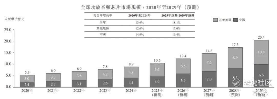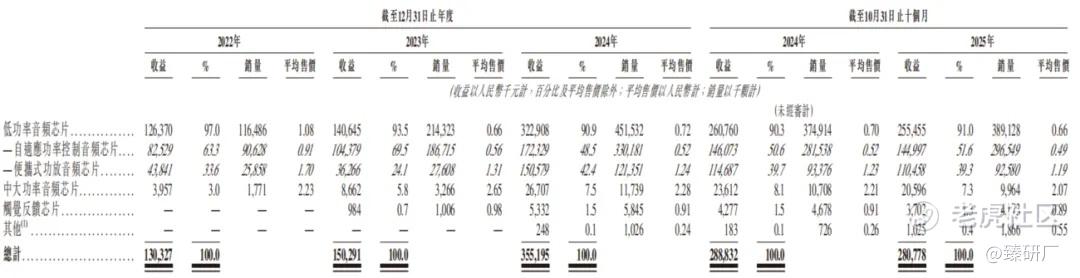 公司的产品包括(1)低功率音频芯片,包括两大类型,即自适应功率控制音频芯片及便携式功放音频芯片;(2)中大功率音频芯片;(3)触觉反馈芯片;及(4)其他,包括电源管理芯片。根据弗若斯特沙利文报告,于2024年,公司在中国交付逾4亿颗功放音频芯片,并在全球交付逾4.5亿颗功放音频芯片。