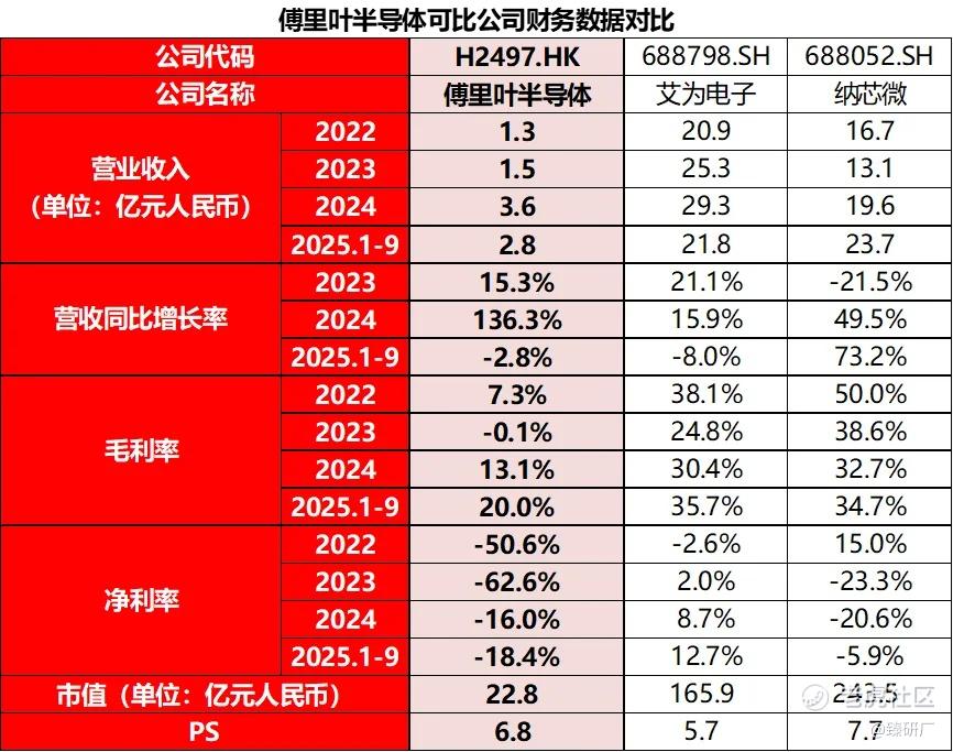 注:表中所列为傅里叶2025年前10个月的财务数据,PS=总市值/(2025年前10个月营收/10*12);艾为电子和纳芯微的PS=总市值/(2025年前9个月营收/9*12)