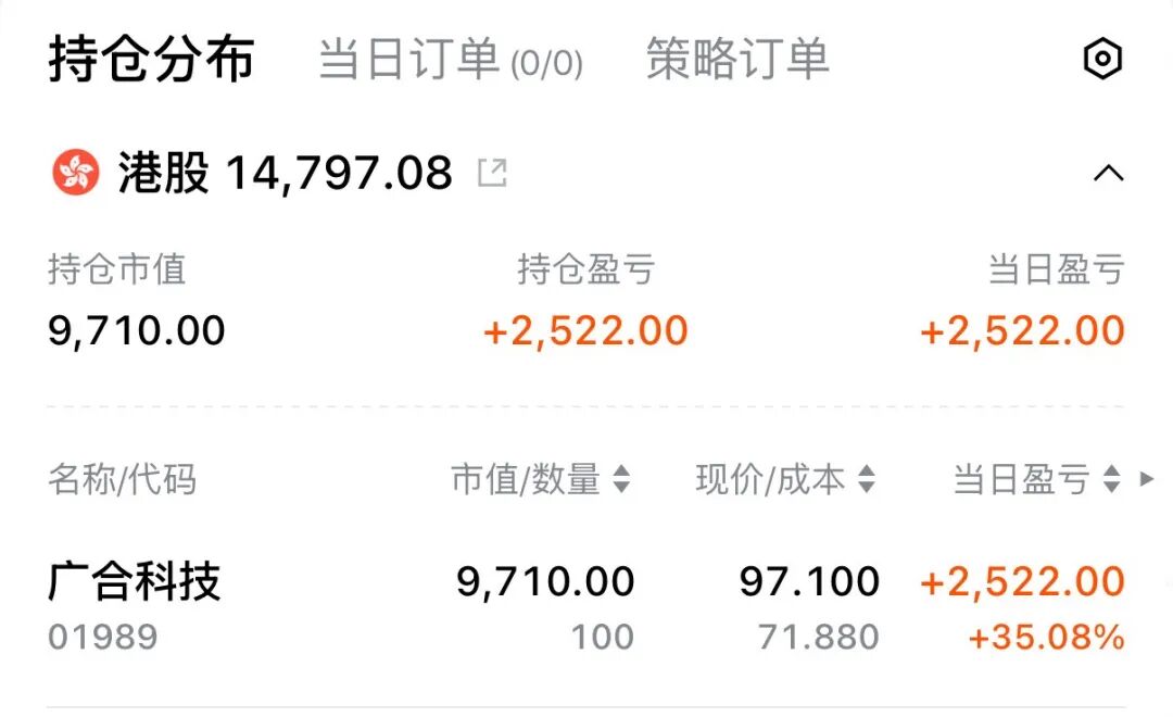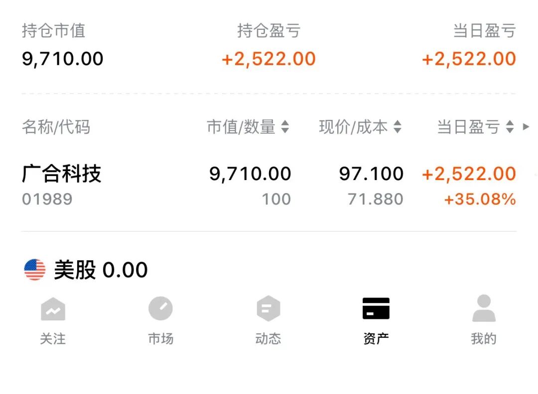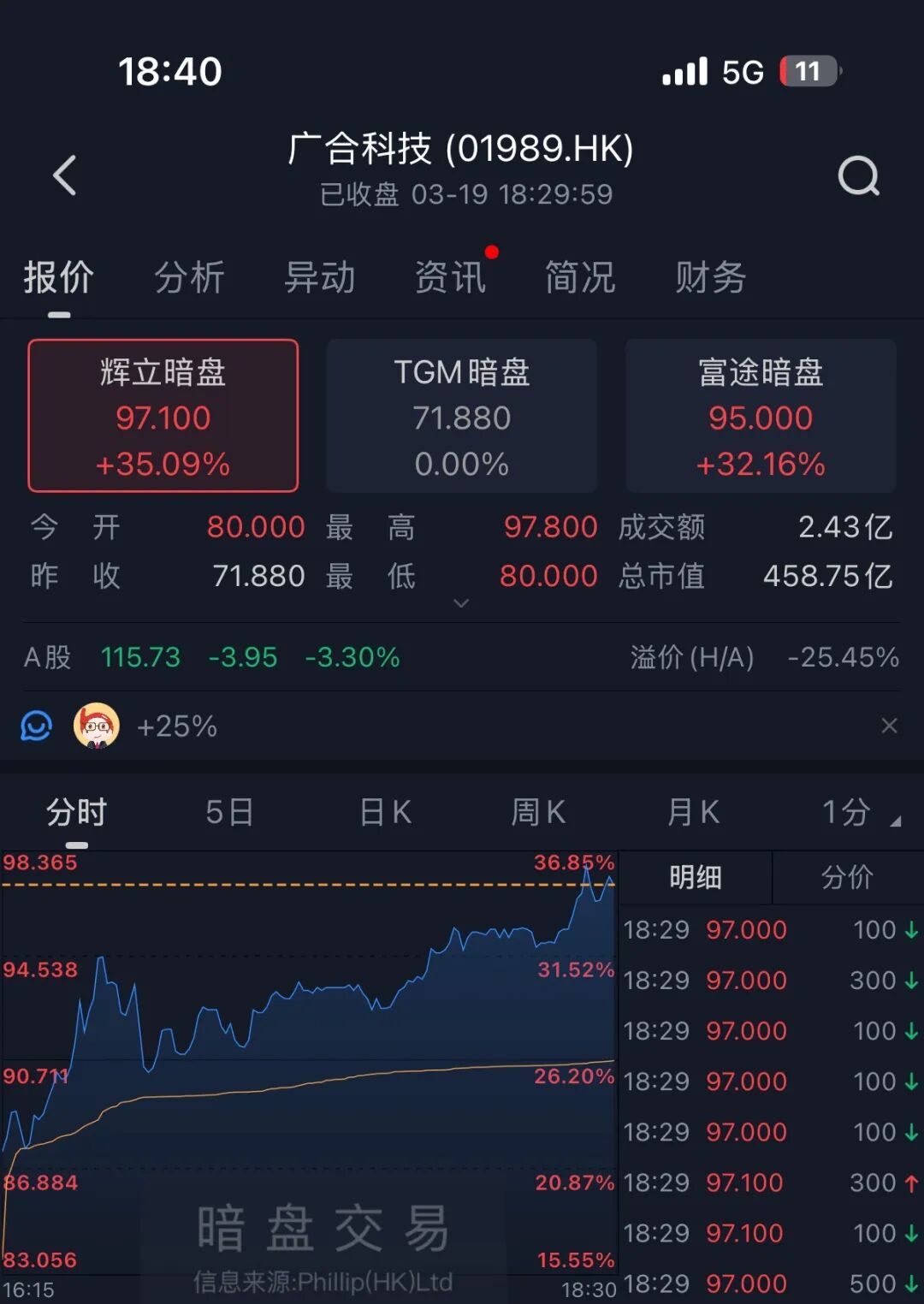 $广合科技 (01989.HK)$ 黯盘高开12%后,稳稳拉升,我预估能涨30个点,最终黯盘收涨35%,表现还不错。我中了2手,都拿着还没出,明天看情况再出吧。看到有黯盘捞货的兄弟又大赚了,我都捞货讳莫如深,只能恭喜了。