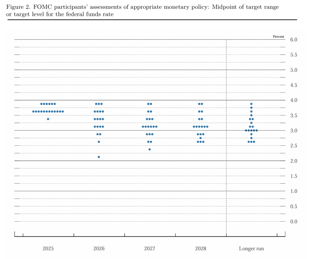 然而,点阵图上的分裂会进一步加剧:去年12月,有7人反对(6人支持不降息,米兰支持降息50bp),对今年预期也割裂严重:3人支持加息一次,分别有4人支持降息0~2次,两人支持降息3次,米兰支持降息更多。目前随着就业和通胀的恶化,点阵图会继续趋向于两侧分化。笔者认为,可能有至少7~8人支持今年不降息甚至加息一次,5~6人支持降息超过1次,中位数仍是降息一次。明年的基准预期可能会是不降息甚至加息,2028年加息1~2次,长期利率不变或者小幅上移。反应在SEP上的利率预期为3.5%,3.5%+,3.75%~4%,3%+。