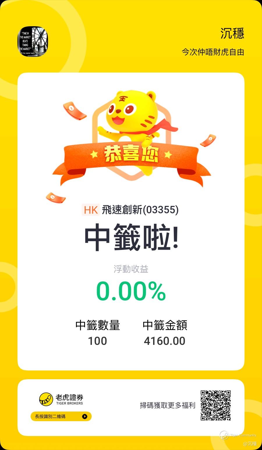 随著港股 IPO 市场热度显著回升,透过$老虎证券(TIGR)$ 的 10 倍融资,成功于光通讯领军企业$飞速创新(03355)$ 的配售中获分配一手。在公开发售录得逾千倍超额认购的激烈竞争下,这次中签不仅反映了资金杠杆在提升获配概率上的策略价值,更为投资组合增添了一抹具备 AI 算力基因的亮色。