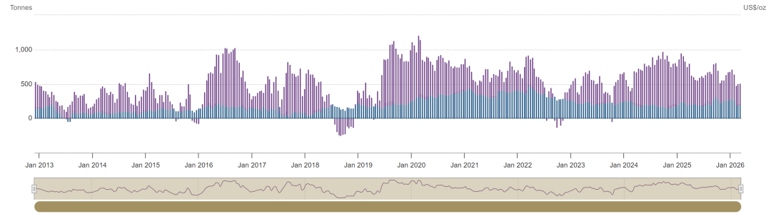 黄金的抛售发生在亚洲时间,在之前我们分享过,黄金在过去2025年12月到1月的资金流入是一个令人瞠目结舌的速度