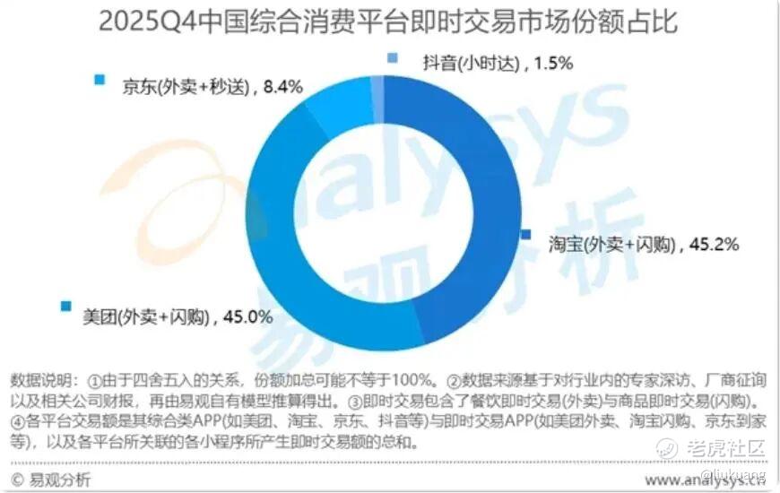易观报告的图注显示,其统计口径将各平台"综合类APP"及"所关联的各小程序所产生即时交易额"一并计入,且对"即时"的履约时效未作任何界定——30分钟、1小时还是4小时,对应的订单量截然不同。这意味着淘宝平台内履约时效超过1小时的天猫超市订单,也可能被纳入"即时交易"统计范畴。在这一口径下,淘宝系的份额天然高于仅统计1小时内履约业务的口径。