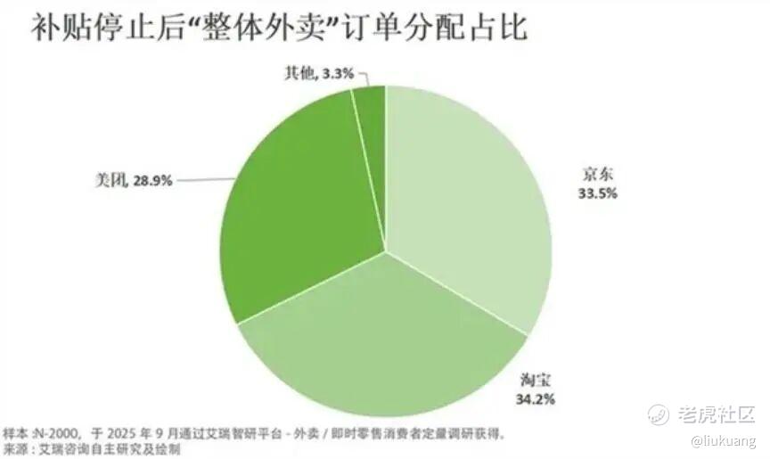 去年9月,艾瑞进一步发布报告《补贴退潮,外卖江湖“三分天下”成定局》。报告预测,在假设补贴完全停止的理性状态下,淘宝闪购/饿了么以34.2%的预期份额微弱领先,京东以33.5%紧随其后,美团则占28.9%。
