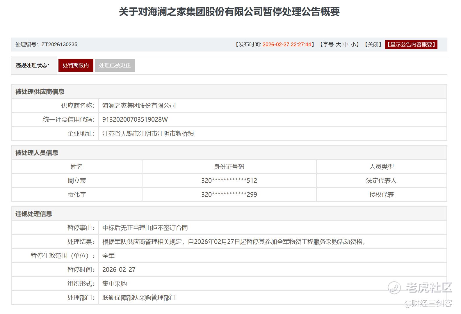 此次处罚的严厉程度,超出了市场的普遍预期。海澜之家不仅被全面暂停参与全军及武警部队各类采购项目的投标资格,覆盖物资供应、工程建设、服务保障等所有品类,彻底失去了这块优质B端市场;更令人震惊的是,公司法定代表人、董事长周立宸及授权代表贡伟宇也被同步列入违规记录,个人职业声誉与企业信用双双受损。这一“企业+个人”的双罚模式,无疑是对海澜之家合规管理的一次全方位拷问。