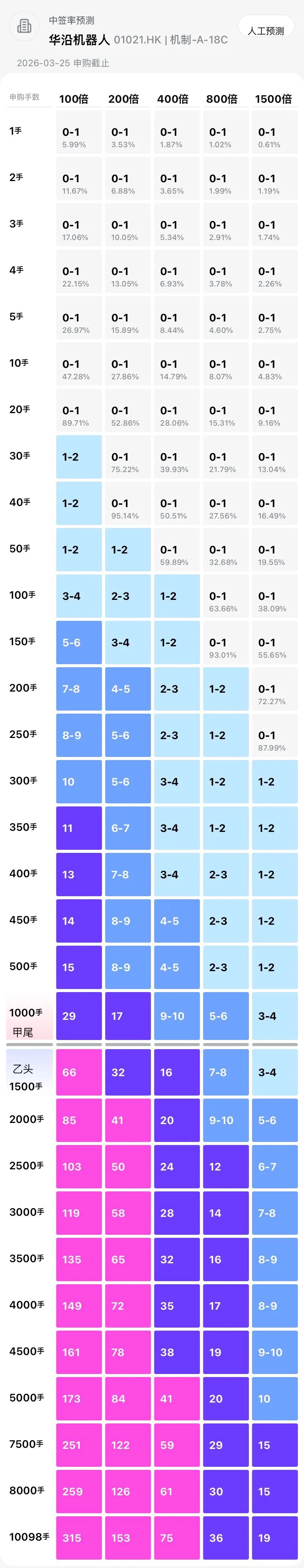 这个中签预估表我觉得,可能预估的孖展太低了,起码应该是2000-3000倍了,那么甲尾大概也就中1-2手,乙头1-2手了。
