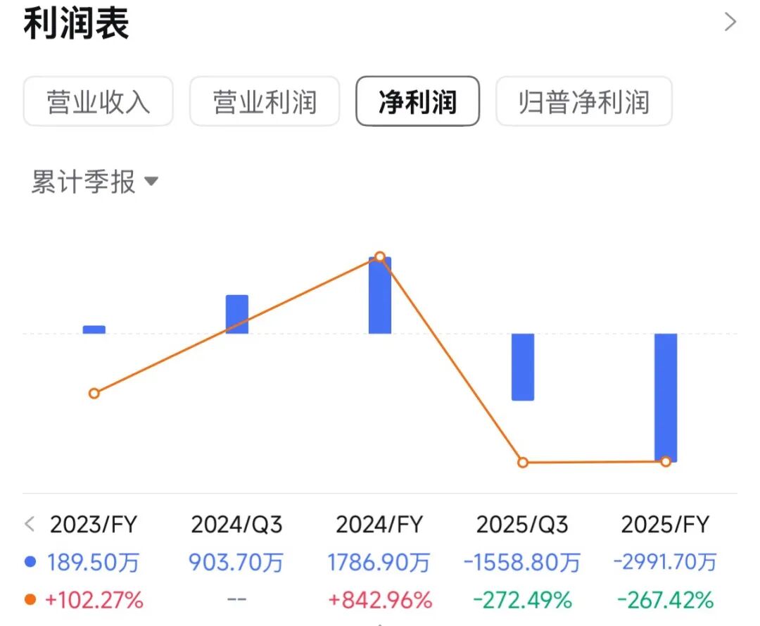 净利分别约为人民币-0.83亿、0.02亿、0.18亿、0.09亿、-0.16亿,2025年前9月同比-272.49%;