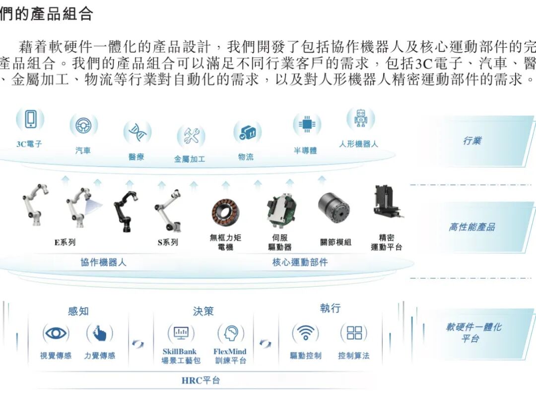 公司的协作机器人产品组合分为E系列和S系列两个主要产品类别,二者均集成了公司自研的HRC具身智能控制平台。