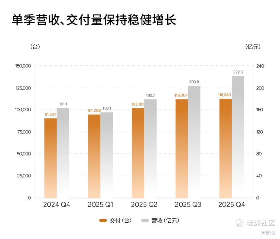 小鹏汽车2025年第四季度营收为222.5亿元,较2024年第四季度增长38.2%,毛利率为21.3%。