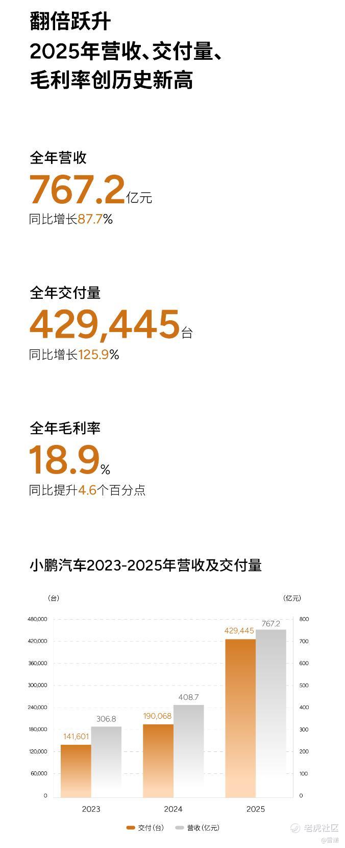 小鹏汽车2025年总交付量为429,445台,同比增长125.9%。其中,2025年第四季度小鹏汽车总交付量为116,249台,较2024年同期的91,507辆增长27.0%。