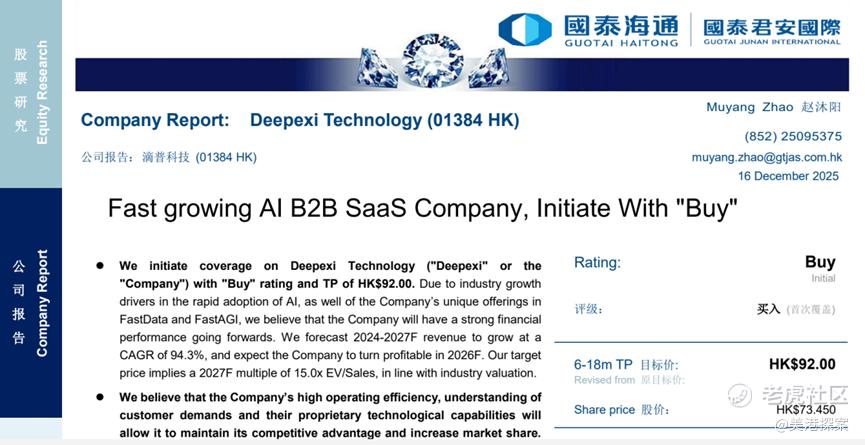 此外,作为资本市场对企业价值的重要参考,国泰君安国际发布的专项研究报告对滴普科技给予高度认可,明确给出“买入”评级及92港元目标价。报告核心观点显示,机构看好公司在企业级AI赛道的长期成长潜力,预测2024-2027年公司营收复合增长率将达94.3%,其中2026年有望实现盈利转正;同时看好行业发展红利,预测2024-2029年中国企业级大模型AI应用解决方案市场规模年复合增长率将达55.5%,2029年市场规模有望突破527亿元,滴普科技作为行业前五的标杆企业,将充分享受赛道增长红利。机构认为,公司在数据工程、模型工程与应用工程的全栈技术能力,以及“标杆案例-规模复制”的商业化路径,是其区于同行的核心竞争优势,也是支撑长期价值增长的关键逻辑。