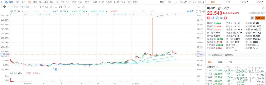 飞速+50%的250亿市值对标的就是Ubiquiti的50倍PE的档次,上市后续咱就不知道了,之前吸血比较厉害的新股容大科技目前走成这样,感觉老板说不定还有点想法,毕竟资本是有逐利性(纯参考绝不推荐,Owen这除了又大又好的票,次新股只打不炒)。