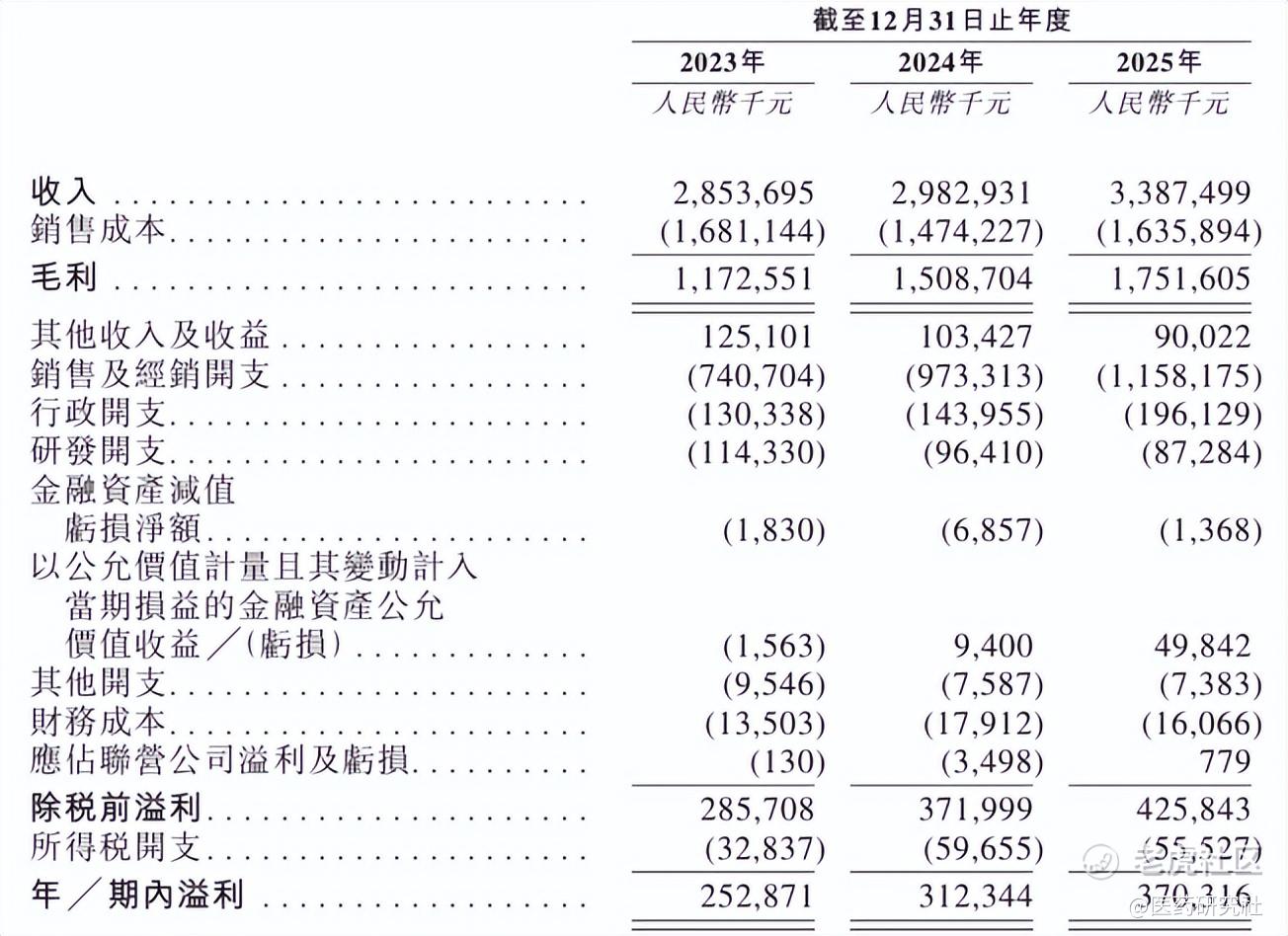 而与海外业务的高歌猛进形成对比的是,国内业务正面临多重挑战,同年境内收入同比增速仅 5.64%。再翻看招股书,2023至2025年,公司营收分别为28.54亿元、29.83亿元、33.87亿元;毛利分别为11.73亿元、15.09亿元、17.52亿元;期内盈利分别为2.53亿元、3.12亿元、3.7亿元。整体增速欠缺爆发力。