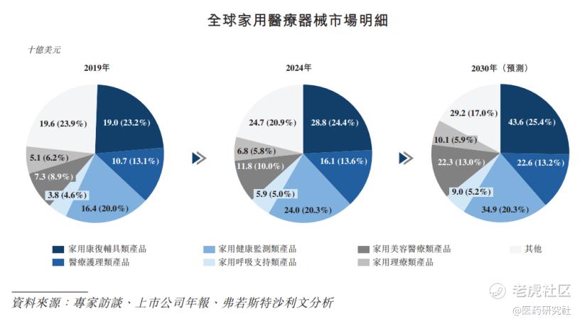 来自弗若斯特沙利文的数据显示,全球家用医疗器械的市场规模在2024年达到1,182亿美元,占总市场的19.0%。而且,2024年至2030年,全球家用医疗器械市场预计将以6.4%的复合年增长率增长,增速快于全球医疗器械市场,并正逐步形成覆盖预防、监测、干预、康复等全链条的家庭健康管理产品生态。