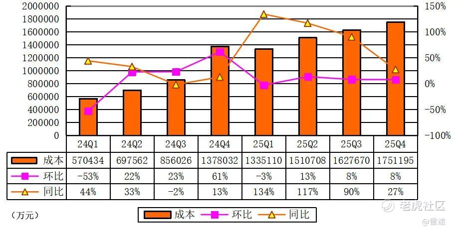 小鹏汽车2025年第四季销售成本175.1亿元(25.0亿美元),较2024年同期的137.8亿增长27.1%,并较2025年第三季度的162.8亿元增长7.6%。