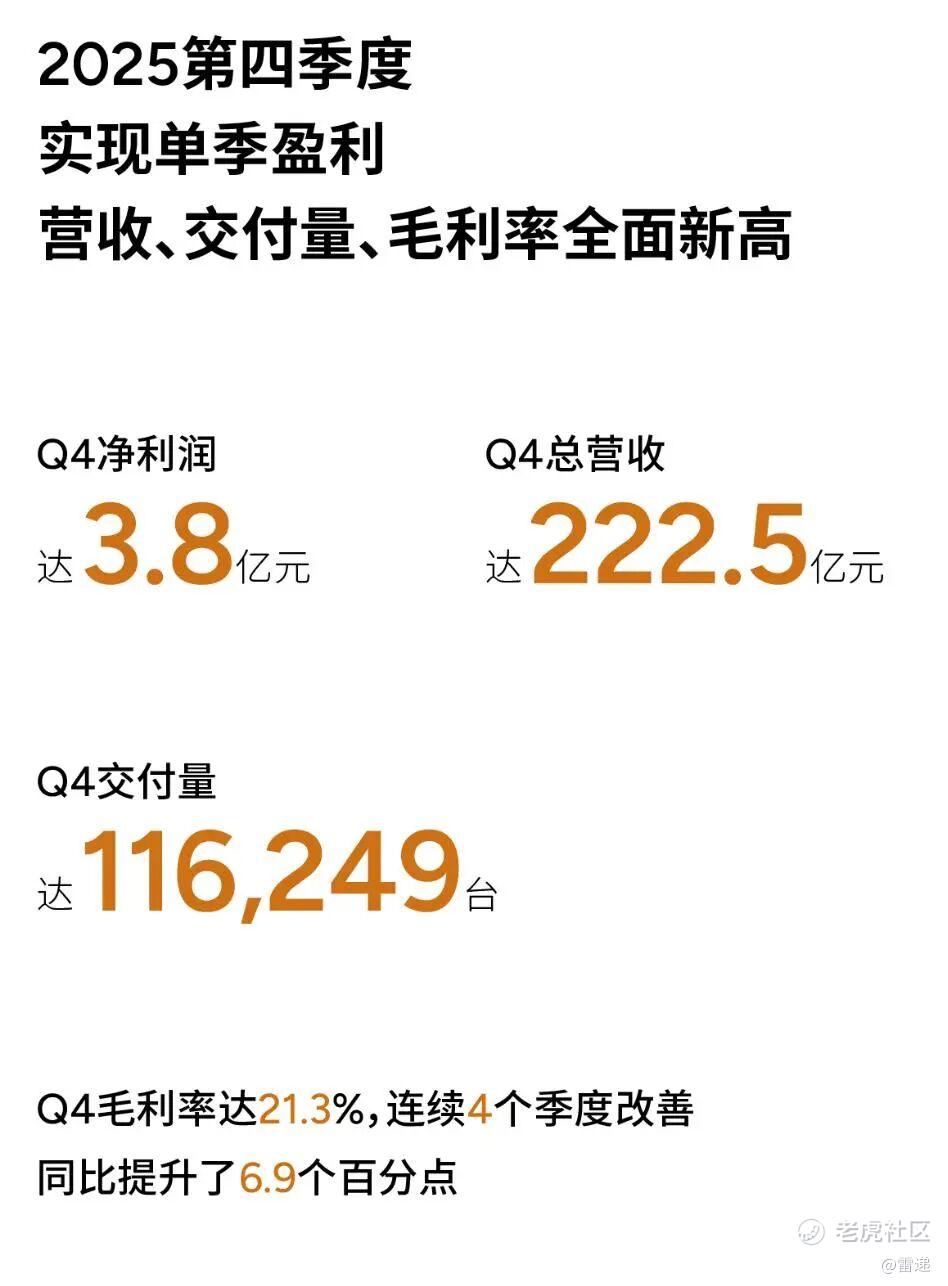 小鹏汽车2025年第四季度营收为222.5亿元,毛利率为21.3%,净利3.8亿,首度扭亏为盈。