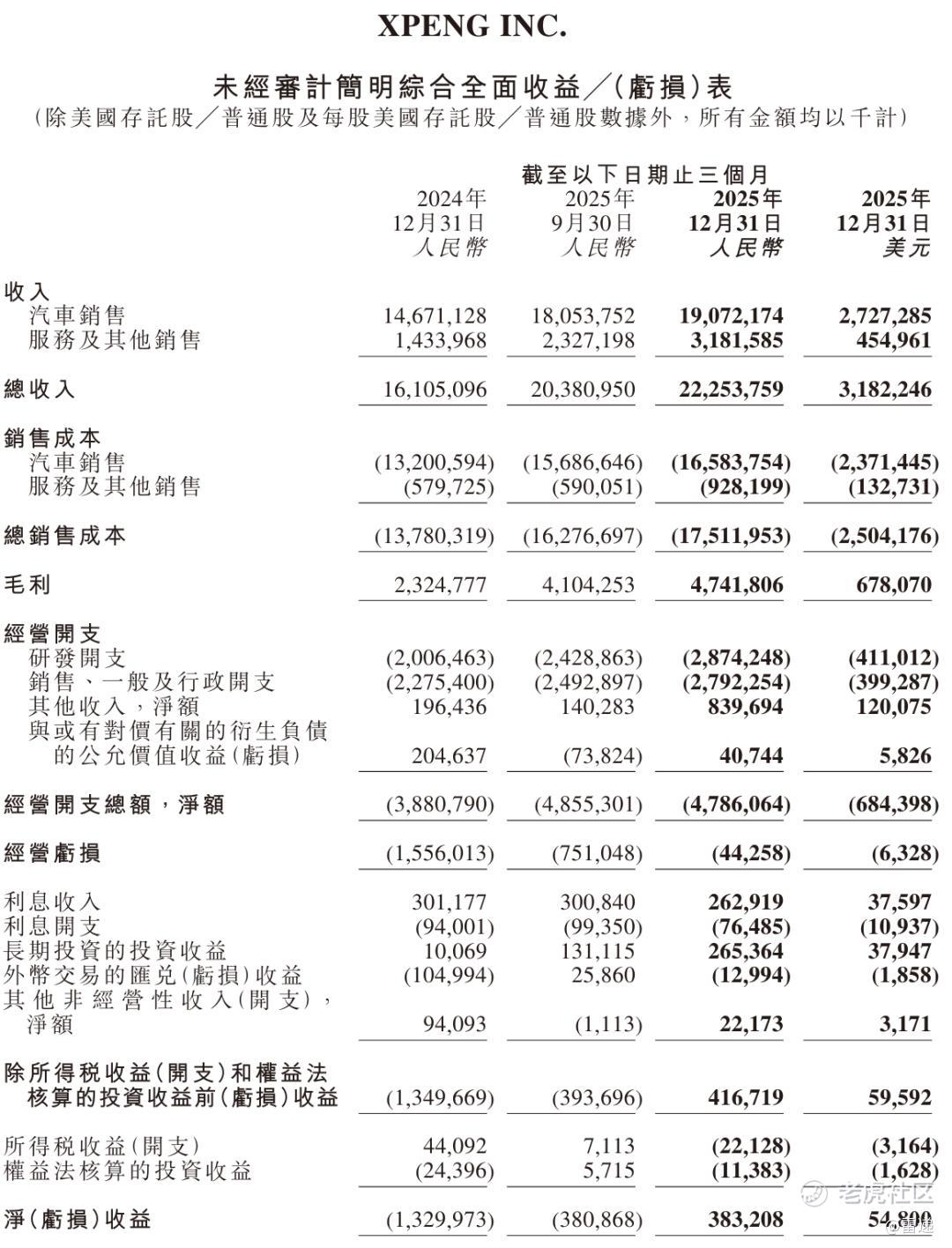 小鹏汽车2025年第四季净利3.83亿,上年同期为净亏损13.3亿元。2025年第四季度经调整净利为5.1亿元,上年同期为经调整净亏损13.9亿元。