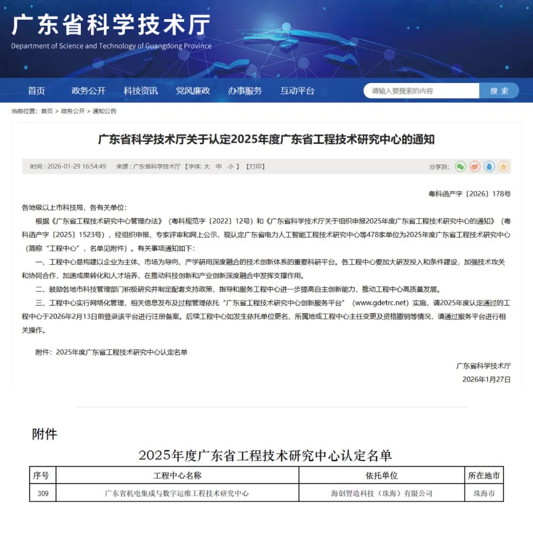 近日,广东省科学技术厅正式发布2025年度广东省工程技术研究中心认定名单,海创智造科技(珠海)有限公司(以下简称“海创智造”)申报的机电集成与数字运维工程技术研究中心成功获得认定。