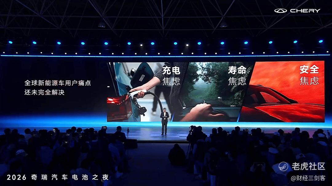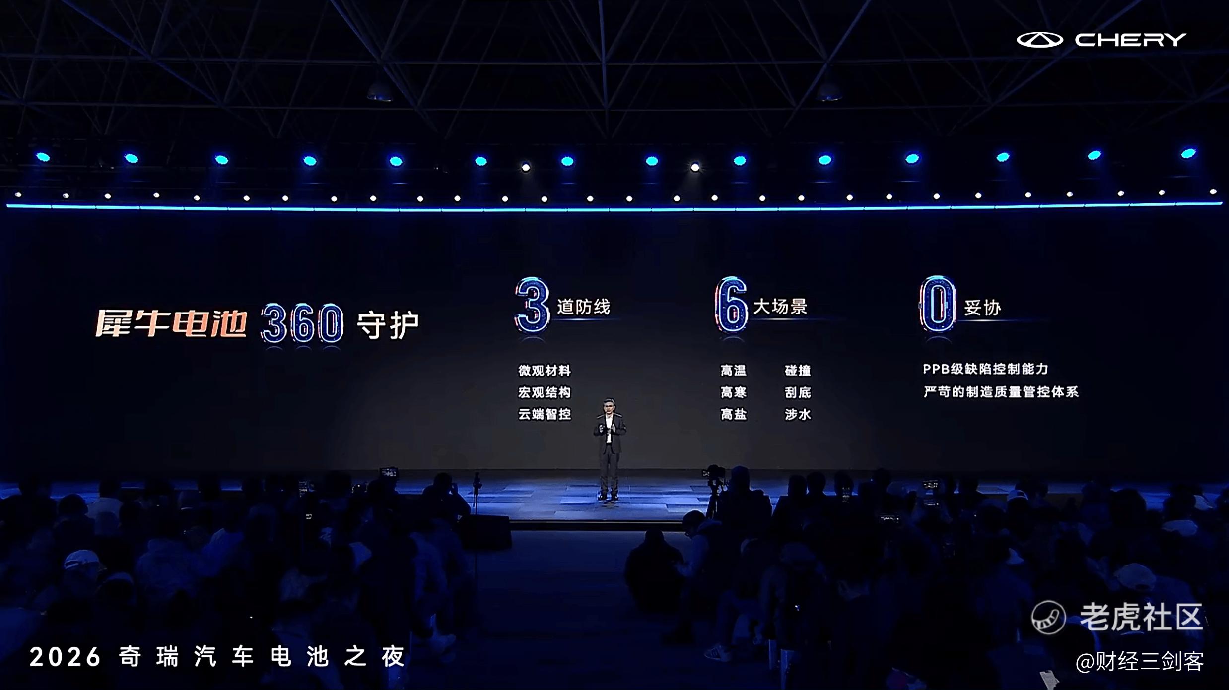 $奇瑞汽车(09973)$ 【文/深度评车&财经三剑客】在新能源汽车行业风起云涌的2026年3月18日,奇瑞汽车迎来了其29周年的重要时刻。奇瑞在芜湖举办2026电池之夜,以“守护”为主题,正式发布犀牛电池。这场活动不仅展示了奇瑞在电池技术领域的深厚积累,更预示着新能源汽车行业即将迎来一场深刻的变革。奇瑞以一块电池为核心,逐一解答了新能源汽车领域的三大难题:充电慢、衰减快、不安全,同时勾勒出了未来能源生态的宏伟蓝图。
