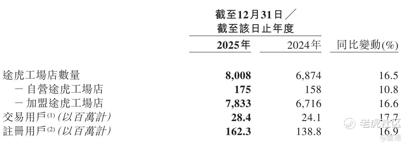 截至2025年12月31日,途虎养车一共有8008家门店,较上年同期的6874家增16.5%;其中,加盟店有7833家,较上年同期的6716家增长16.6%。