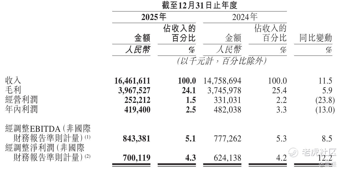 途虎养车2025年经调整EBITDA为8.43亿元,较上年同期的7.77亿元增长8.5%;经调整EBITDA率为5.1%,上年同期为5.3%;