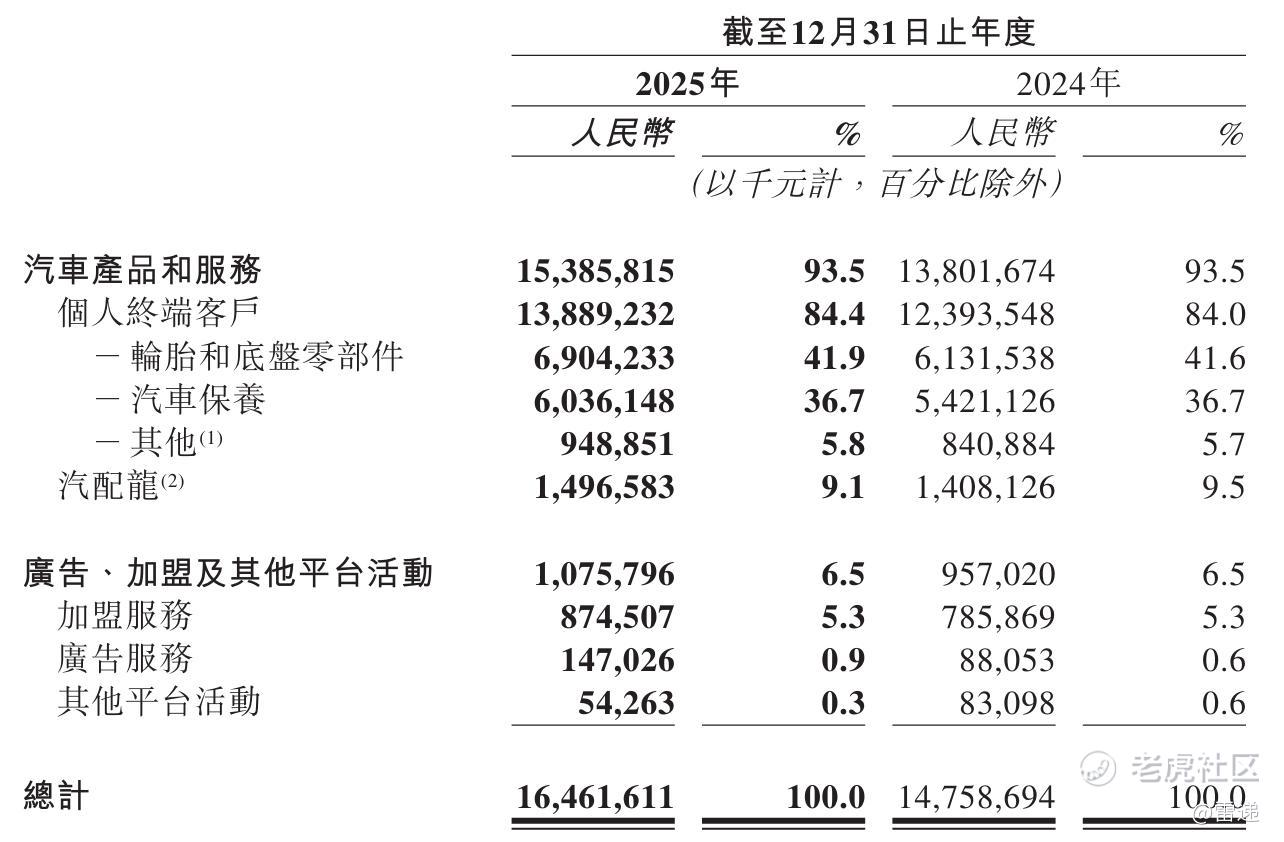 途虎养车2025年来自汽配龙收入15亿,占比9.1%;来自加盟服务收入为8.75亿元,占比为5.3%;来自广告服务收入为1.47亿元,占比为0.9%。