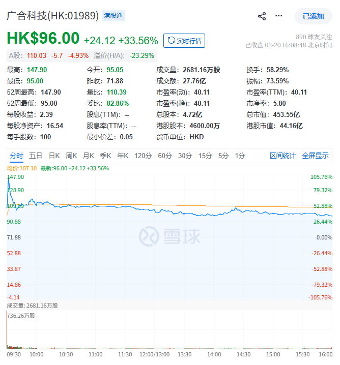 截至首日收市,广合科技每股收报96.00港元,涨33.56%,目前总市值约453.55亿港元。