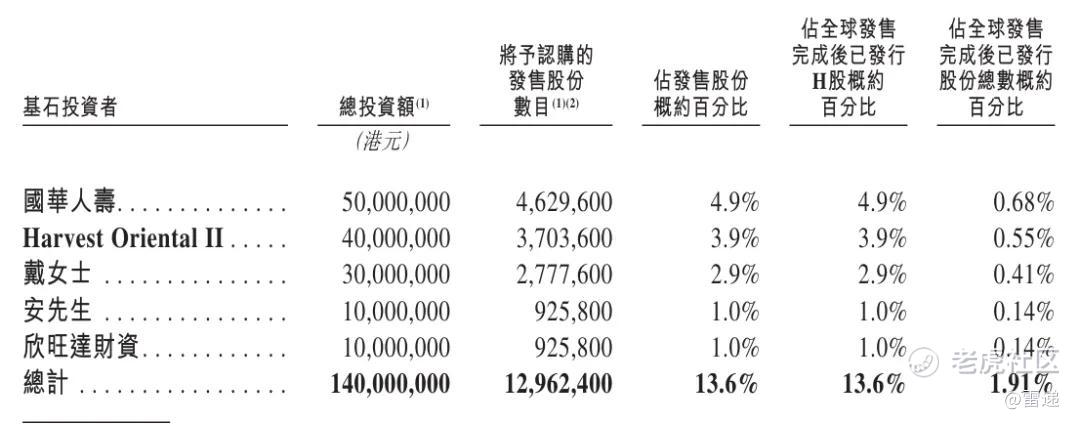 国民技术基石投资者分别为国华人寿、Harvest Oriental II、戴婉琴女士、安江波、欣旺达财资,一共认购1.4亿港元。