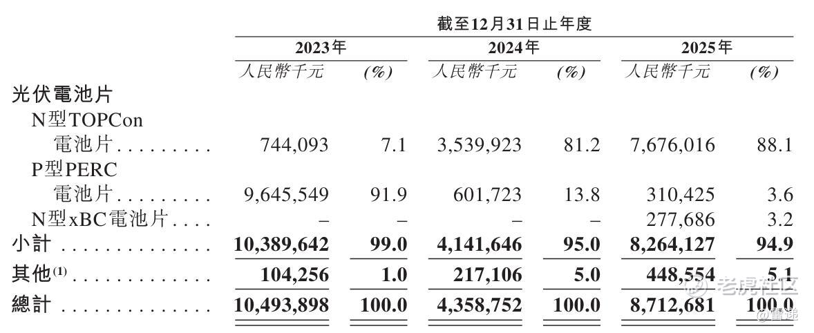 英发睿能2025年来自N型TOPCon电池收入为76.76亿元,占比为88.1%;来自 P型PERC电池片收入为3.1亿元,占比为3.6%;来自N型xBC电池片收入为2.78亿元,占比为3.2%。