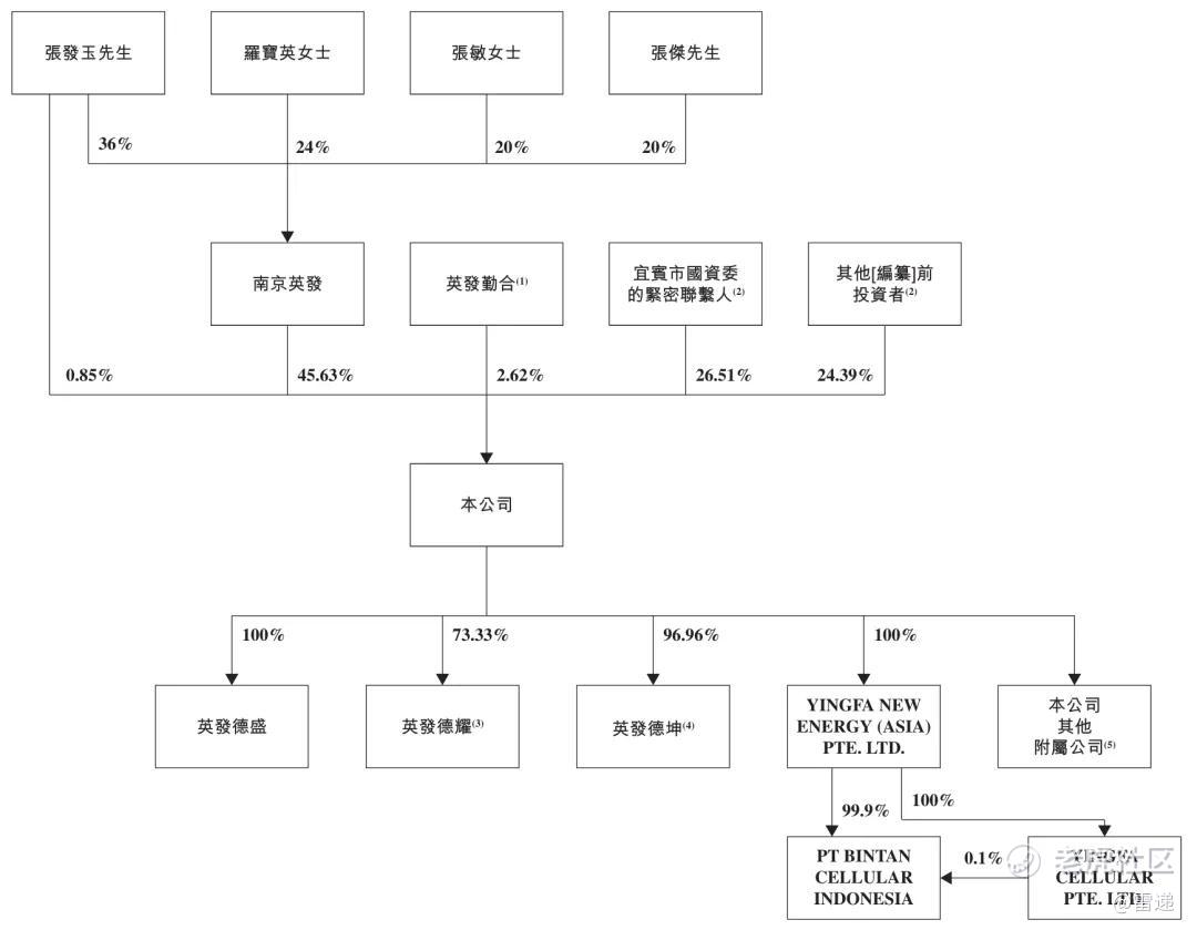 IPO前,南京英发持有英发睿能45.63%权益,南京英发由张发玉持有36%、罗宝英女士持有24%、张敏女士持有20%及张杰持有20%权益;英发勤合持有约2.62%权益,其普通合伙人为张发玉;及张发玉持有约0.85%权益。张发玉与罗宝英女士为配偶,且为张敏女士及张杰的父母(统称「张发玉家族」),张发玉家族控制公司49.1%股权。