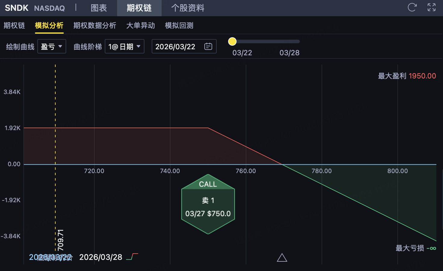 从策略角度看,SNDK当前隐含波动率达到96.69%,本身就说明市场对后续波动已有较高定价。在这种情况下,如果判断SNDK到期前难以有效站上750美元上方,继续单边大涨的概率有限,则可考虑直接卖出750美元的Call,通过收取高权利金来博取时间价值回落带来的收益。