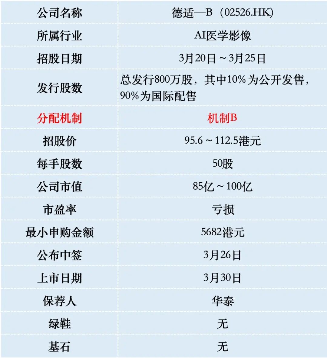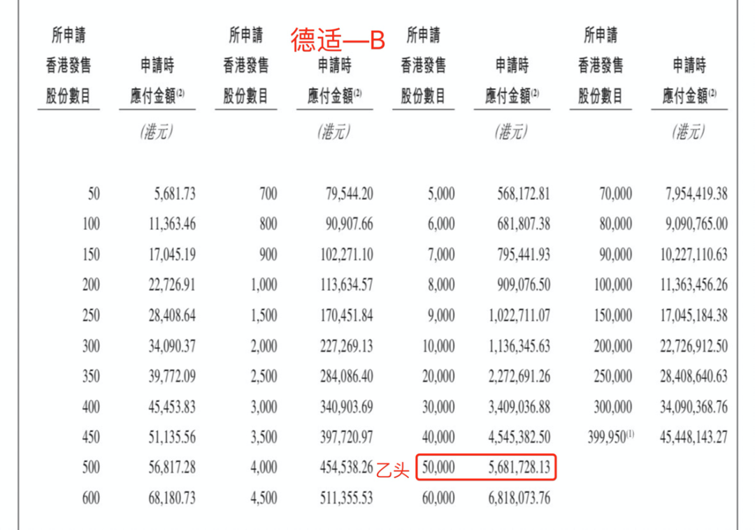 德适生物目前孖展13倍,最终大概率会超购1000倍,甲乙组各8000手。申购人数按照10万人算,预估一手中签率3%,甲组全部抽签。