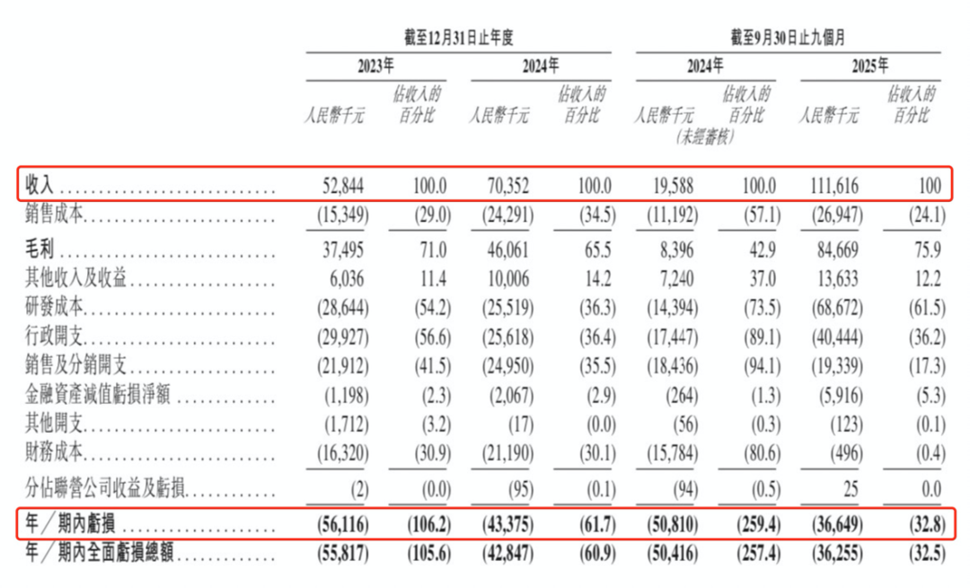 而真正的起飞在2025年前9个月,营收猛增至1.12亿元,要知道,2024年同期这个数字是0.20亿元,这意味着同比增速达到了惊人的460%,这种接近5倍的增长速度,说明他们的商业化闭环已经彻底跑通了。更亮眼的是,毛利率提升至75.9%,净亏损进一步收窄至3665万元。
