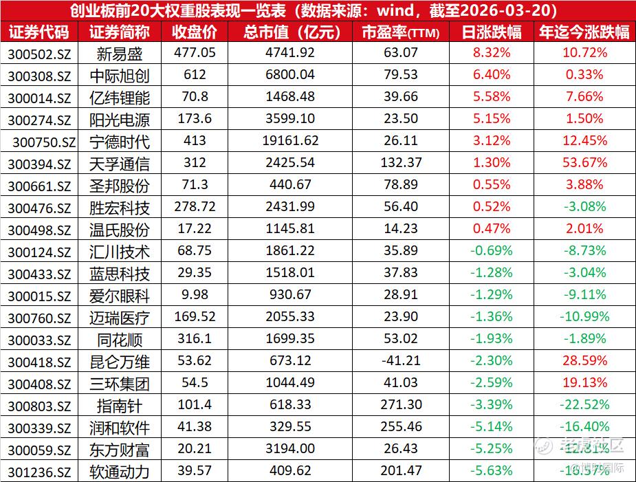 深市创业板前20大权重股表现一览表: