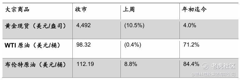 本周经济数据显示通胀压力进一步上升,在不确定性中,美联储保持观望状态,市场已经不再预期年内存在降息的机会,并且认为有约30%加息的机会。另一方面,美国经济增长或已出现放缓迹象,而影响通胀的能源价格仍然高企,因此市场担心美国出现滞涨。本周市场由于恐慌,出现一定程度的抛售,资产配置方面,我们提醒投资者关注基本面及估值,战术性选择现金流强劲,受地缘政治影响较小的标的进行逢低买入,以获得超额收益。