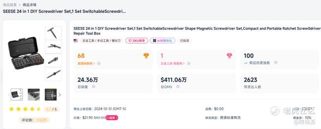 近日,TikTok美区一款24合1多功能螺丝刀套装成为现象级单品,凭借实用功能与场景化传播迅速走红。数据显示,在3月9日至15日这一周内,该产品销量突破5000件,单周GMV超10万美元;累计销量已达24.36万件,总销售额突破410万美元,折合人民币超2800万元,并且登上了五金工具类目销量榜第一。