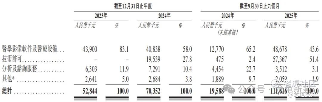 主要营收来源于医学影像软件及医疗设备、大模型技术许可和分析及咨询服务及其他,具体明细见下图。