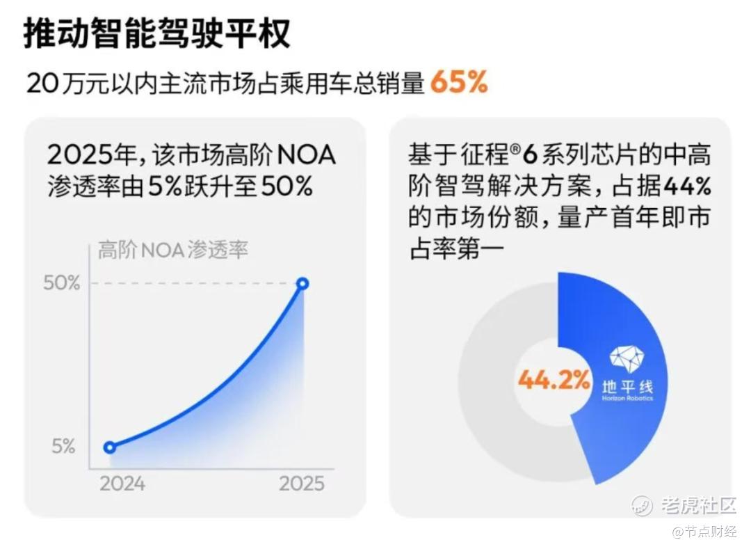 更关键的是20万元以内,搭载着NOA的自主品牌,地平线占有44%的份额,简而言之就是将“高端智驾”做成了“国民标配”。而且作为国内唯一满足全阶辅助智驾需求的量产方案,地平线征程6系列已成功将城区NOA带入15万元级国民车市场。2026年,基于单颗征程6M的城区辅助驾驶方案,将进一步普惠至7万—10万元级车型。