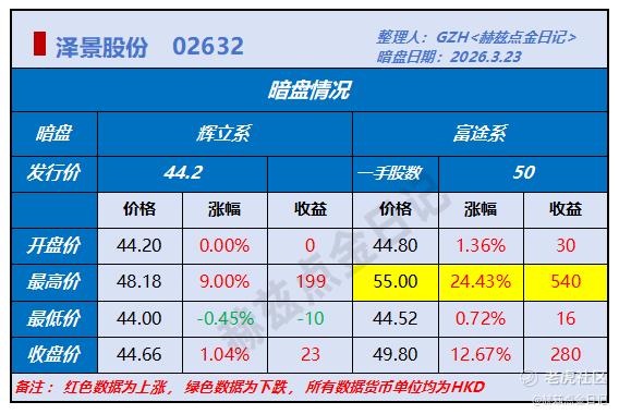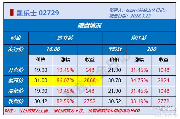 中3签;可惜的是中在辉系暗盘,收益大打折扣,暗盘3签都出了;富系暗盘一签最高涨24.43%,最高赚540港币。两大暗盘差的有点多,分歧比较大,明天情况不好说。