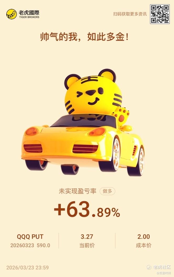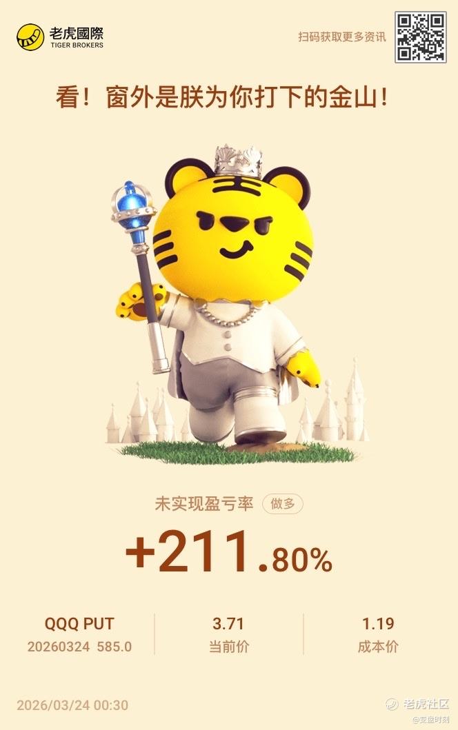各位如何?盘前提前开的QQQ 585 PUT香槟还是喝到了几口,因为我1.19仓位加倍了,200%盈利时还截图了(如下)。顺带还买了日内0323 590 PUT,也小赚,哈哈,感谢嘲讽,就是抗压能力强