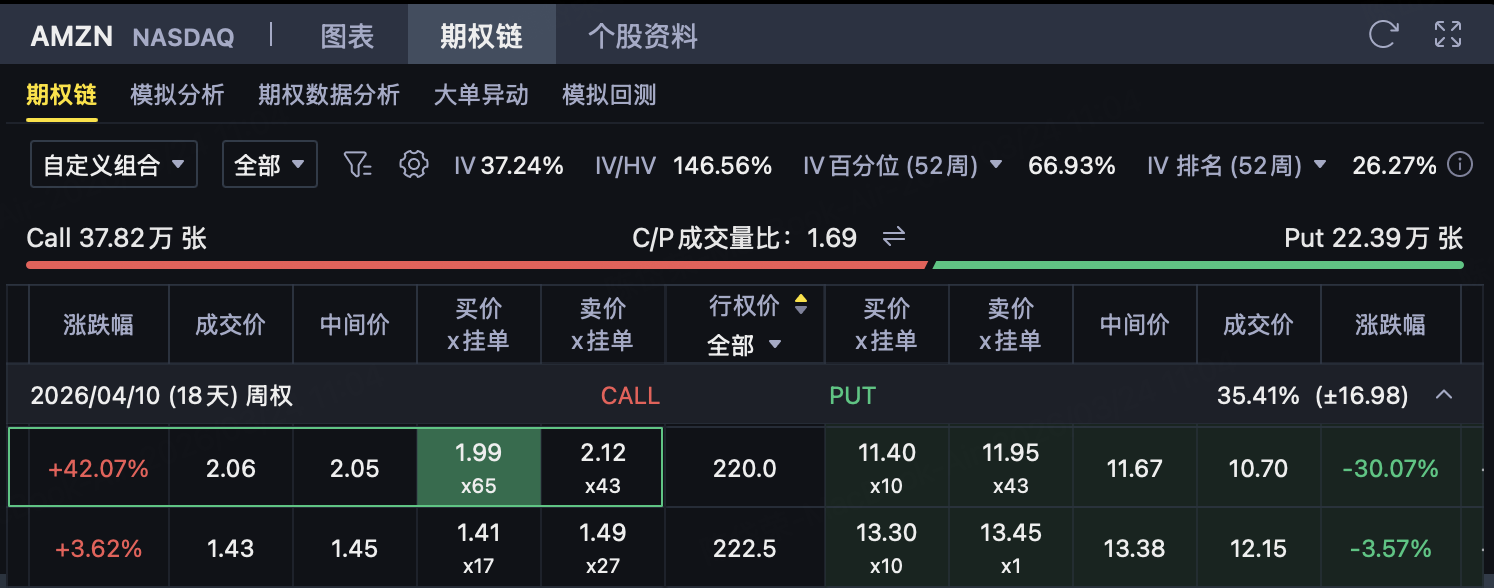 这条Call腿用于博取AMZN在到期前难以有效站上220美元。只要到期价格≤220美元,这份Call失效,投资者可保留对应权利金。